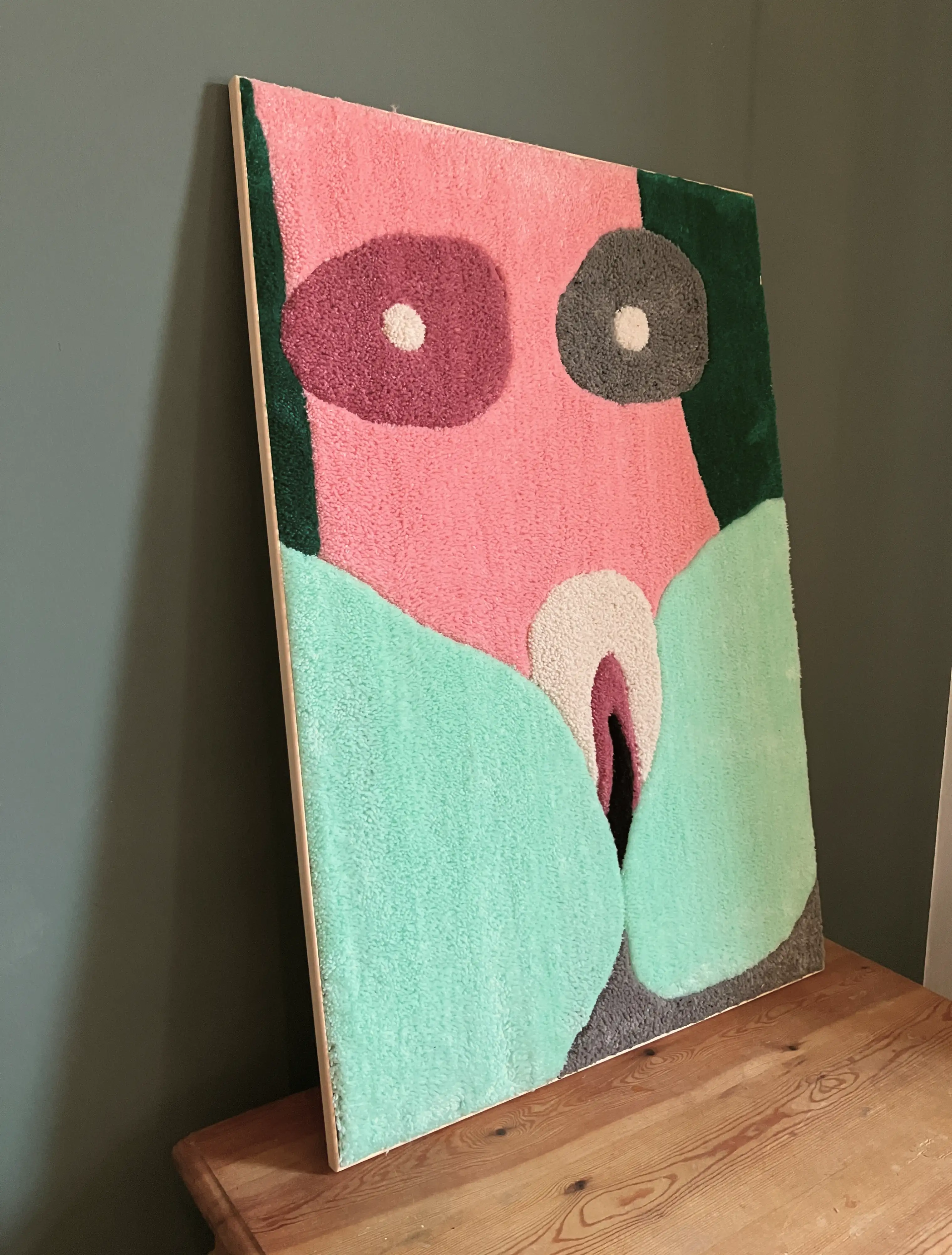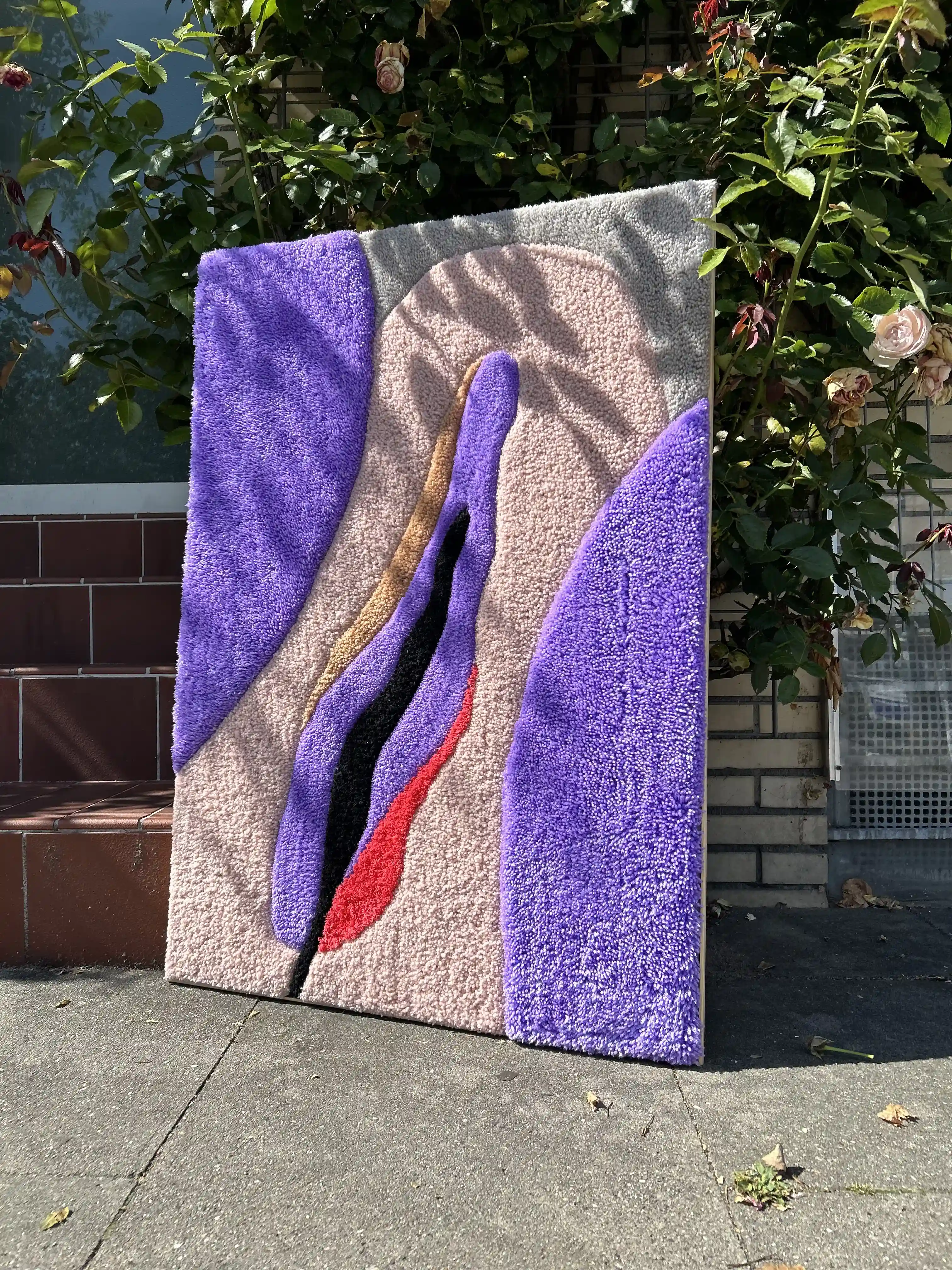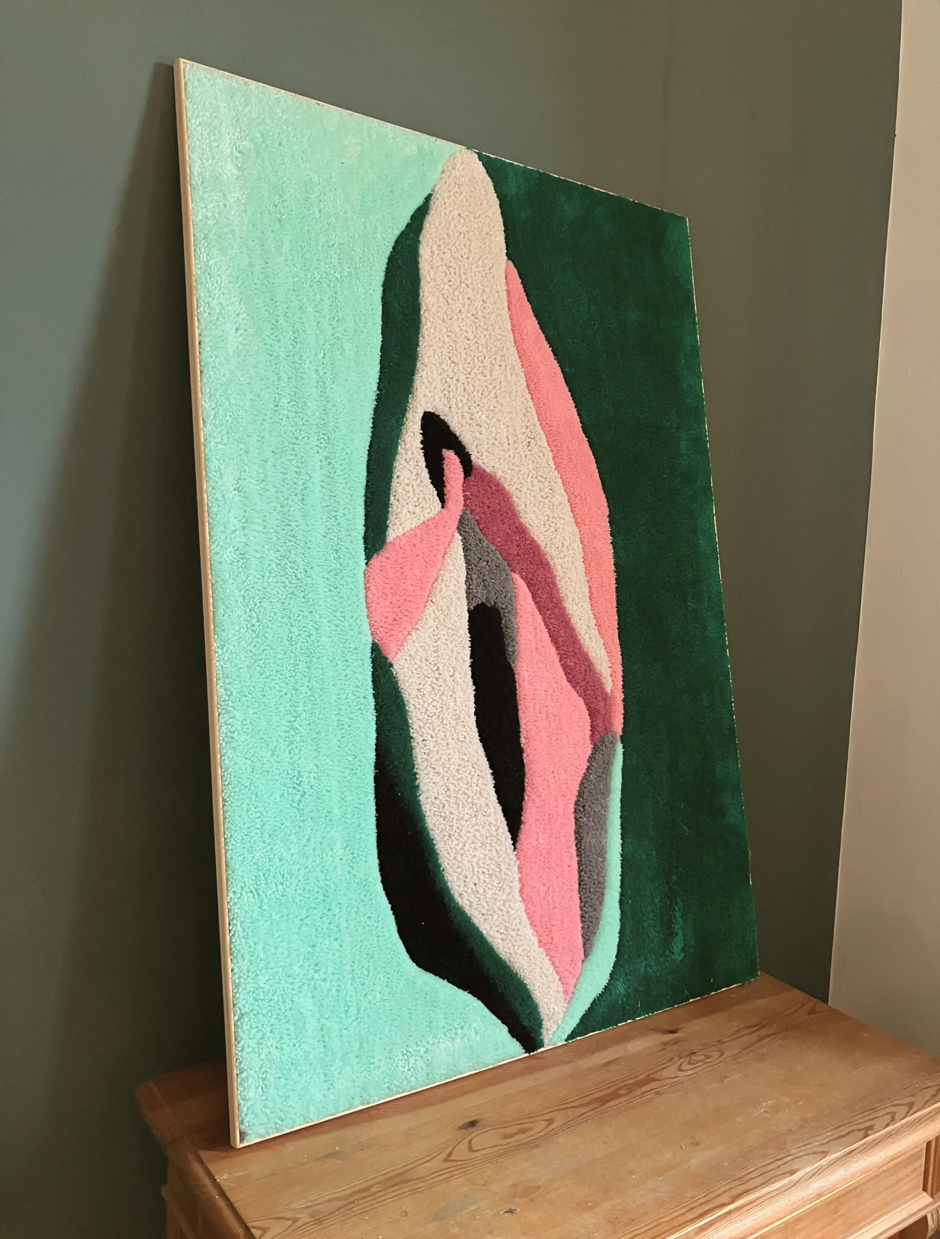 Tufted rug made of a mix of acrylic, cotton and wool. This was a commission. It is a personal portrait of a vulva.