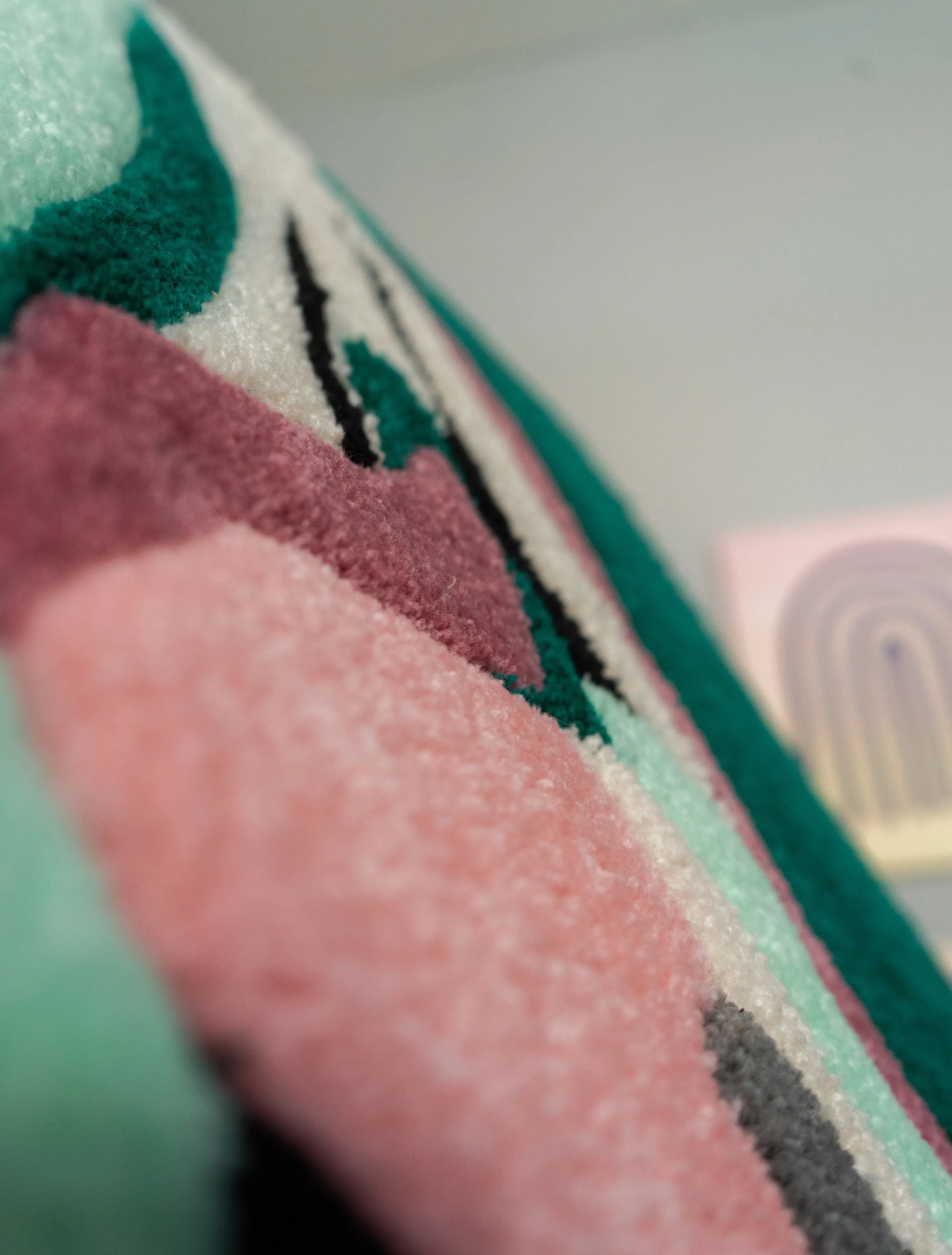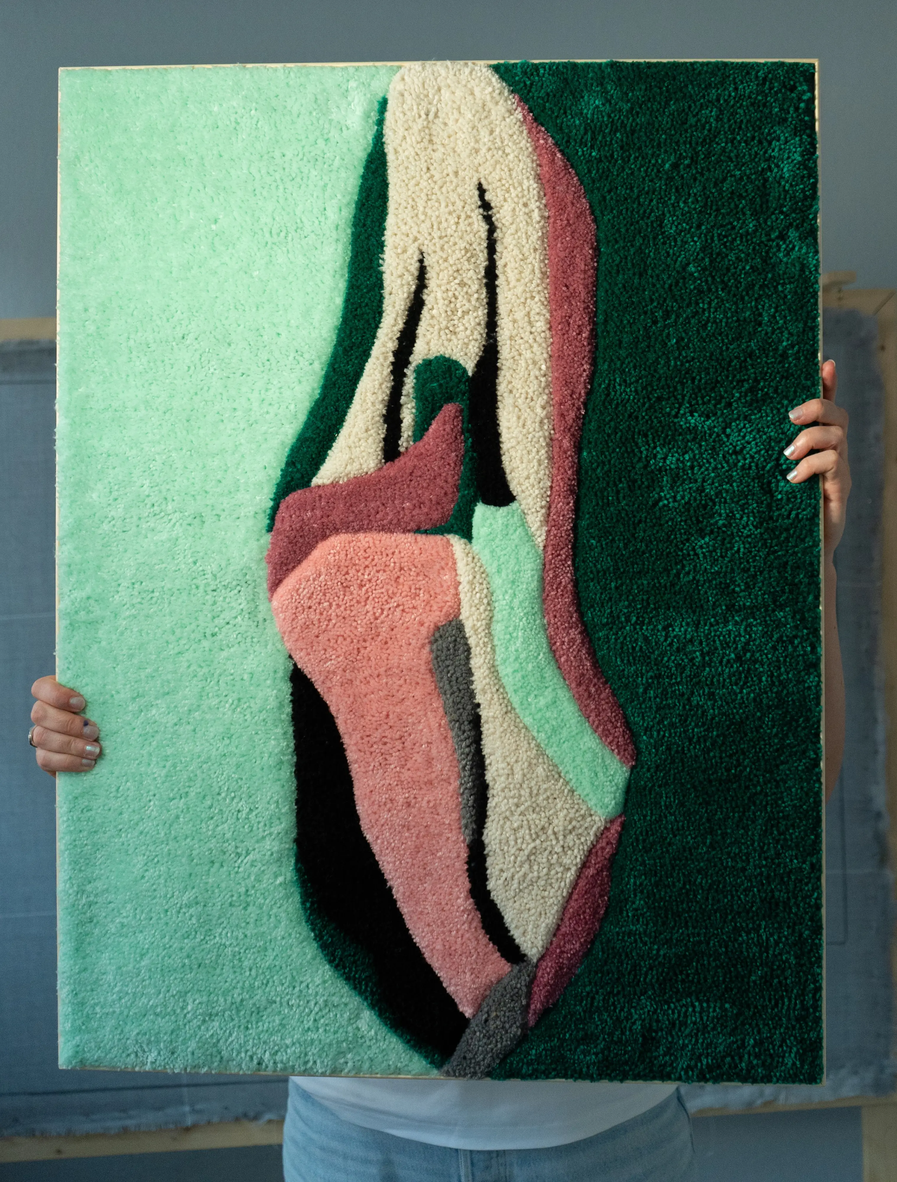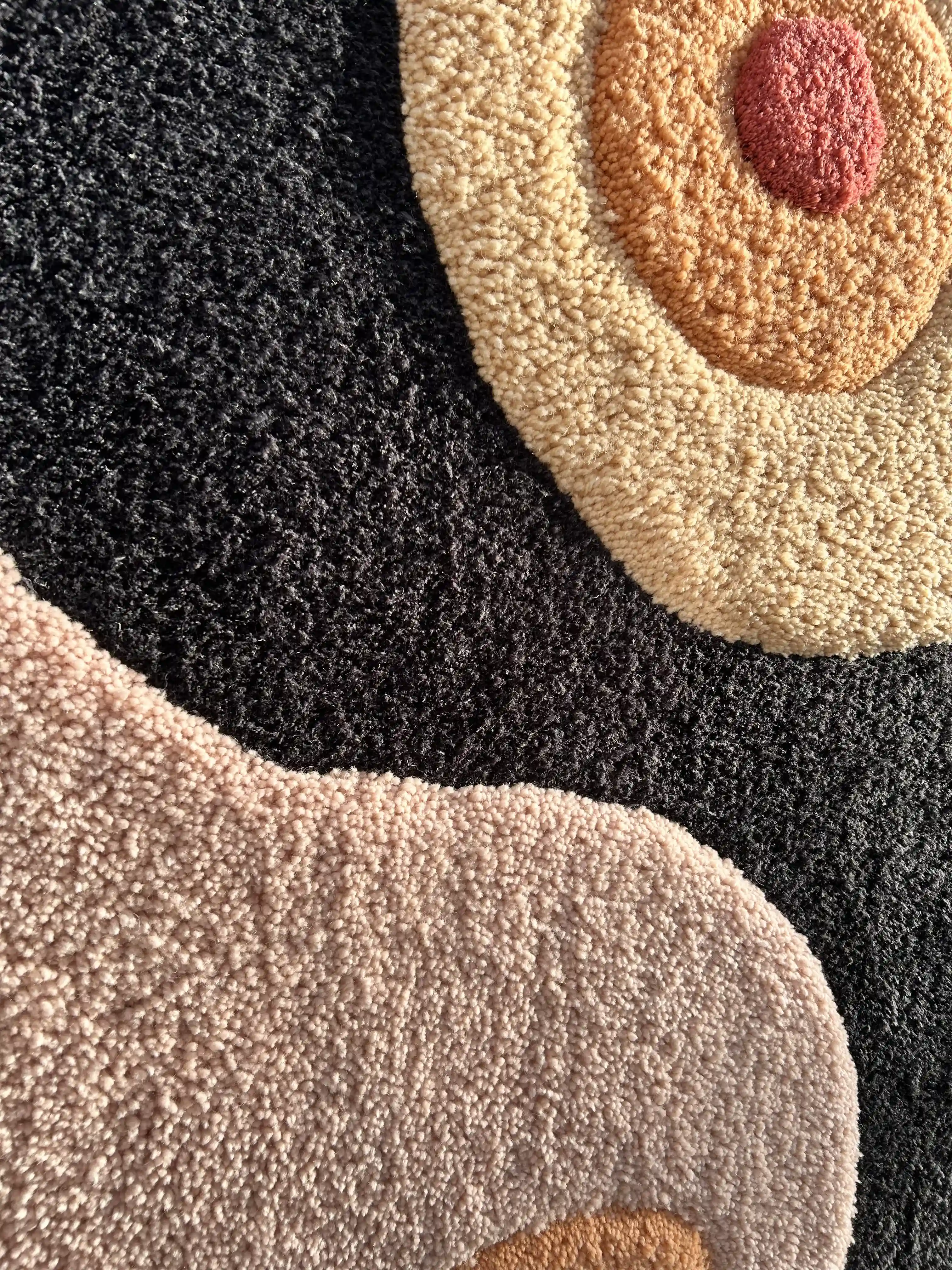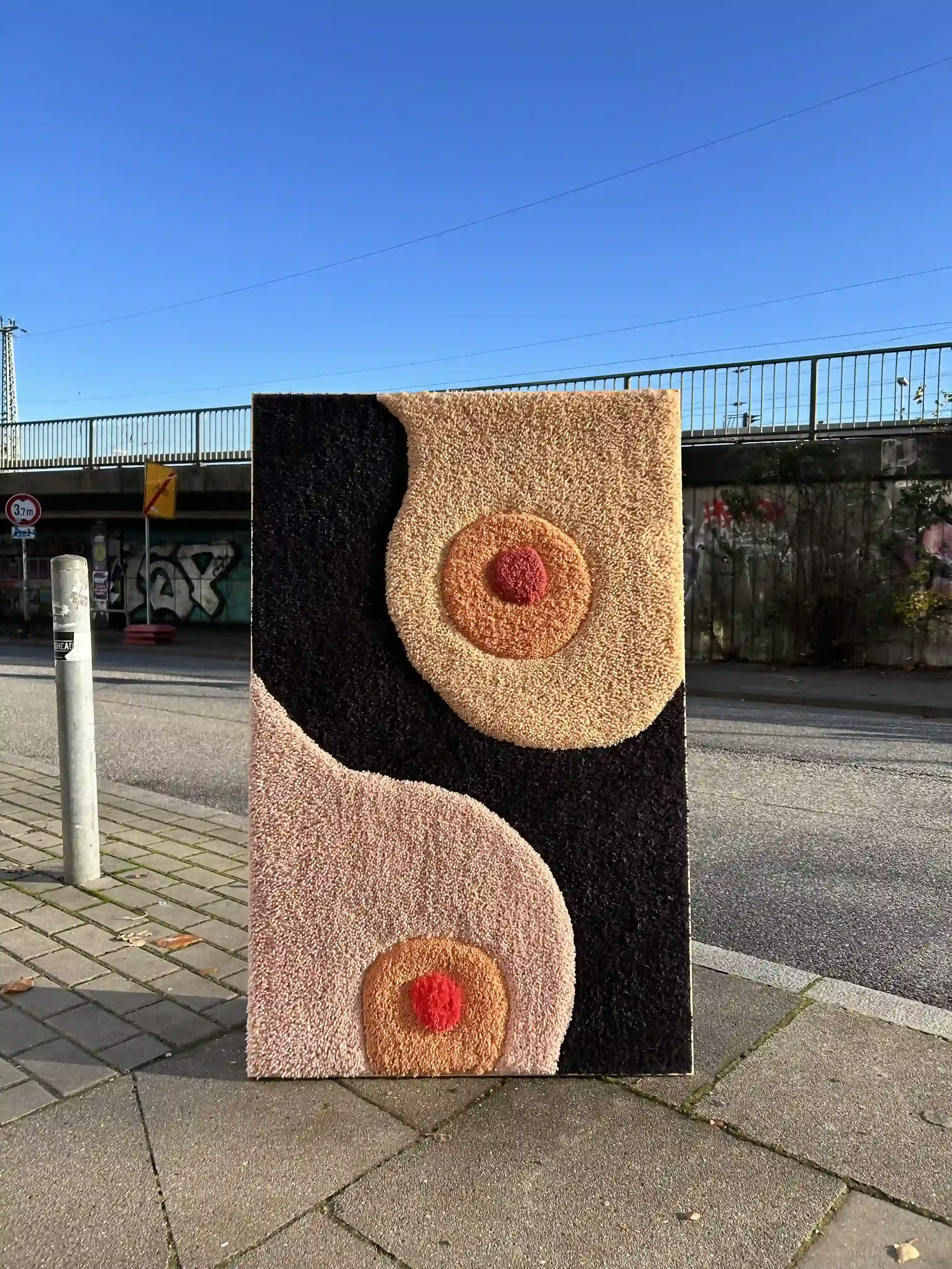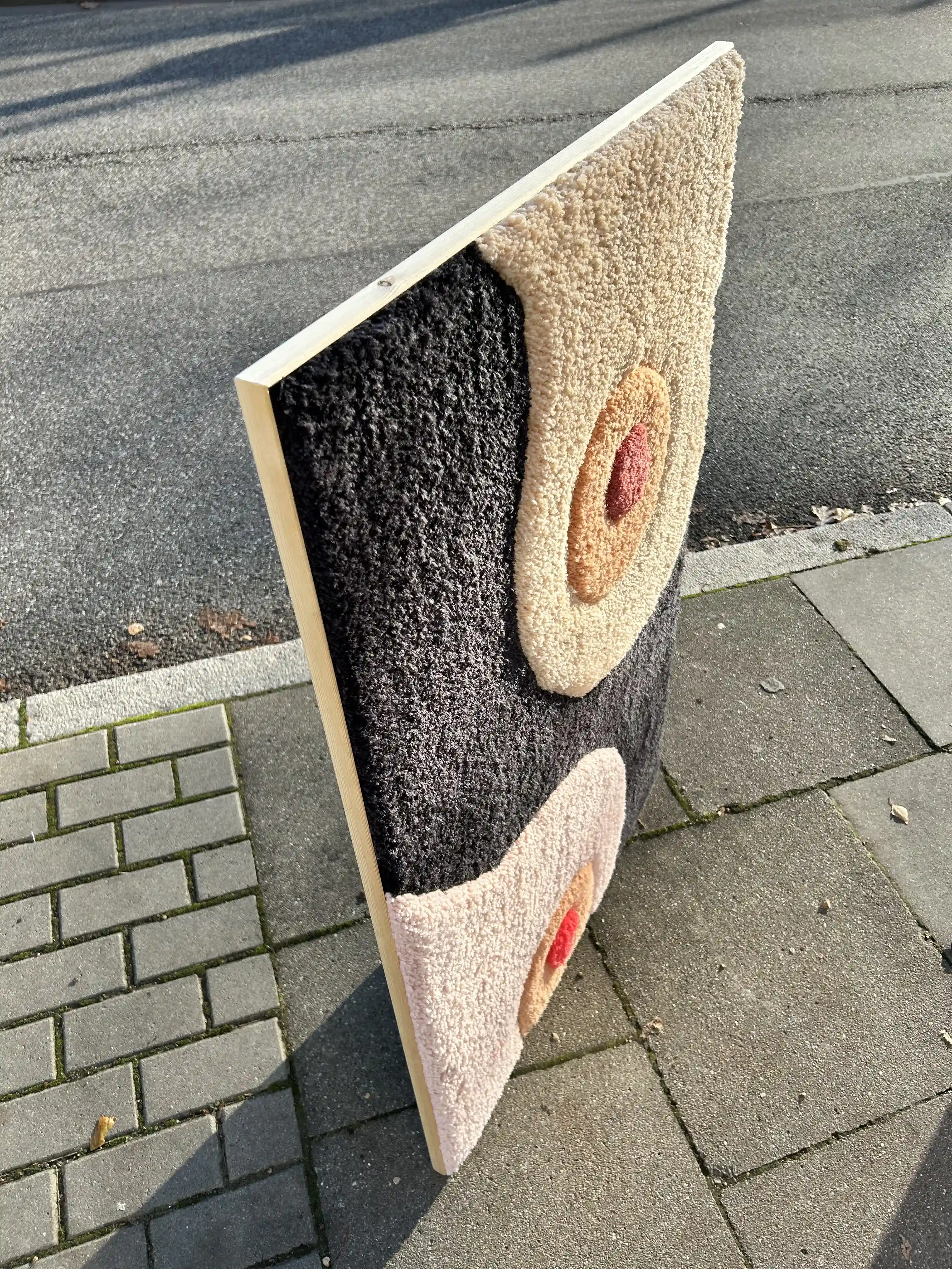 Tufted rug made of a mix of acrylic, cotton and wool. Two boobs floating in space. Three dimensional heights.